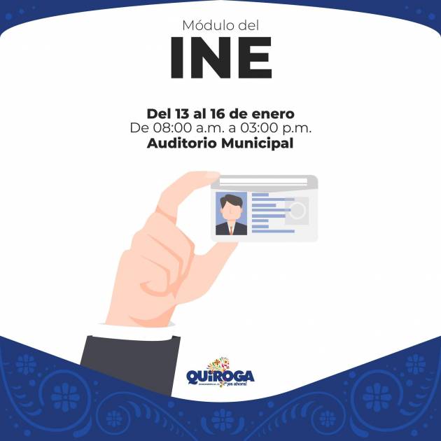Quiroga, Michoacán, a 13 de enero 2025.- Como resultado de las gestiones del Gobierno de Quiroga, para acercar los servicios de registro y actualización electoral a las comunidades del municipio, del 13 al 16 de enero, el módulo del Instituto Nacional Electoral (INE) estará en el Auditorio Municipal, en un horario de 8:00 a.m. a 3:00 p.m.