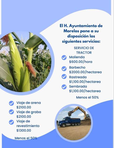 Villa Morelos, Michoacán, a 15 de noviembre de 2024.- En apoyo al campo, la ganadería y la vivienda, el Ayuntamiento de Morelos ofrece un 50% de descuento sobre los precios establecidos en los servicios de tractor y viajes de materiales.