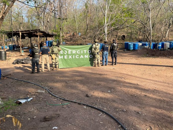 Huetamo, Michoacán, 10 de junio del 2025.- En un operativo interinstitucional efectuado en el municipio de Huetamo, las secretarías de Seguridad Pública (SSP) y de la Defensa Nacional (Defensa), la Fiscalía General de Estado (FGE) y la Policía Municipal, desmantelaron un laboratorio para la elaboración de drogas, donde encontraron contenedores tipo tina que en su interior contenían sustancia granulada con las características propias de la metanfetamina.