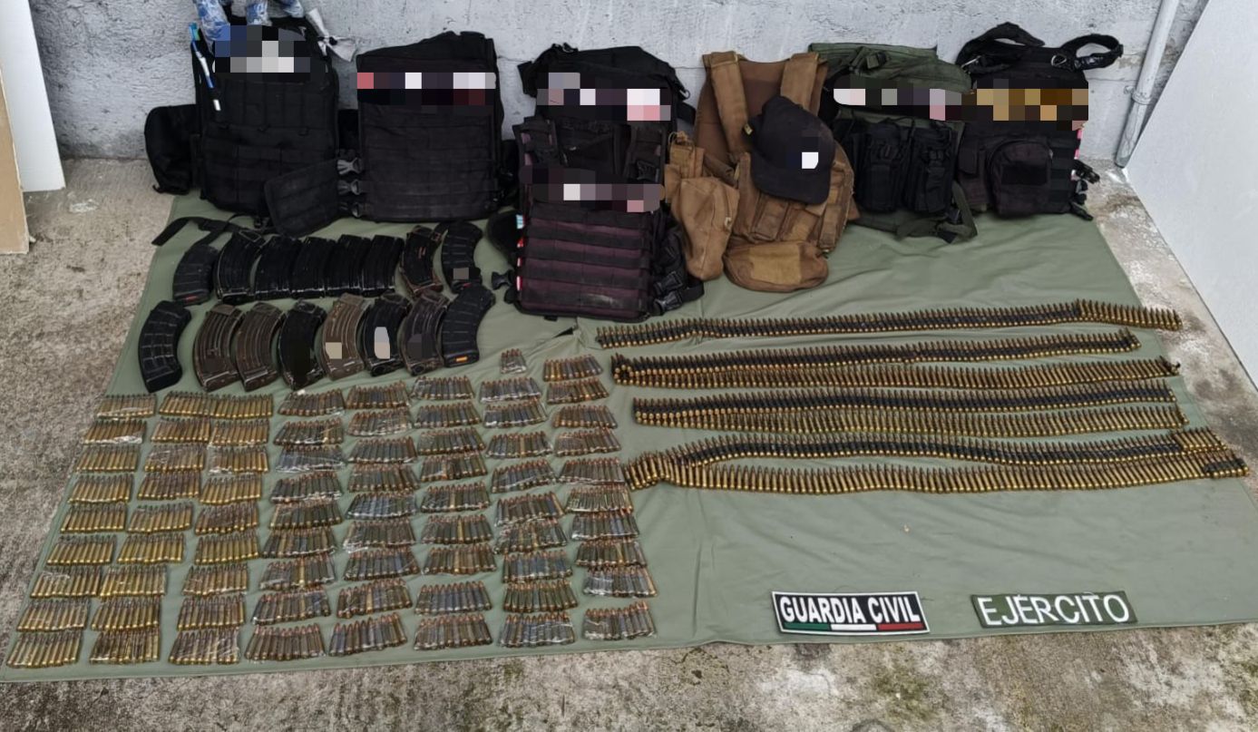 Tras implementar la búsqueda de los presuntos responsables, las fuerzas de seguridad hallaron en un predio siete chalecos tácticos con siglas alusivas a una célula delincuencial, así como los mil 410 cartuchos útiles para diferentes calibres.