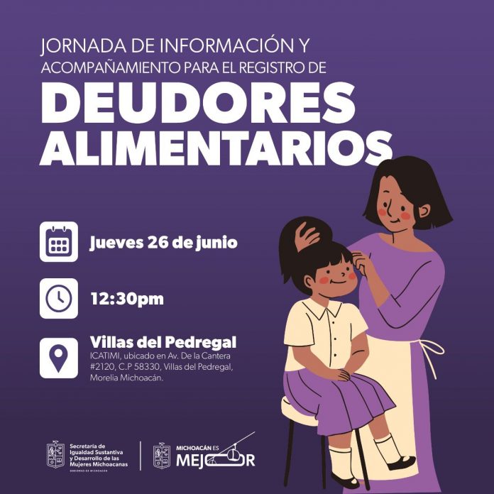 Morelia, Michoacán, 24 de junio de 2025.- La Secretaría de Igualdad Sustantiva y Desarrollo de las Mujeres Michoacanas (Seimujer), encabezada por Alejandra Anguiano González, realizará una jornada de información y acompañamiento para el registro de deudores alimentarios en Villas del Pedregal, como parte de la estrategia integral del gobierno de Michoacán para garantizar justicia alimentaria en el estado.