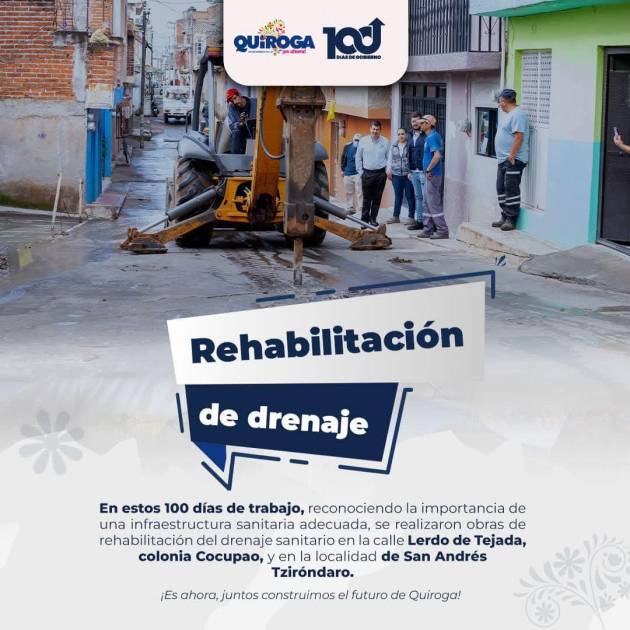 Por otro lado, la alcaldesa resaltó que en estos primeros 100 días de trabajo, también se enfocaron acciones en el mejoramiento de la infraestructura sanitaria, fundamental para el bienestar y desarrollo de las localidades de Quiroga. En este sentido, se llevaron a cabo obras de rehabilitación del drenaje sanitario en la calle Lerdo de Tejada, en la colonia Cocupao, así como en la localidad de San Andrés Tziróndaro.