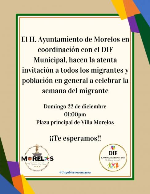 Villa Morelos, Michoacán, a 19 de diciembre 2024.- Para reconocer la invaluable contribución que los migrantes hacen al desarrollo económico, social y cultural del municipio, el Ayuntamiento de Morelos, en coordinación con el Sistema para el Desarrollo Integral de la Familia (DIF) Municipal, celebrará la Semana del Migrante.