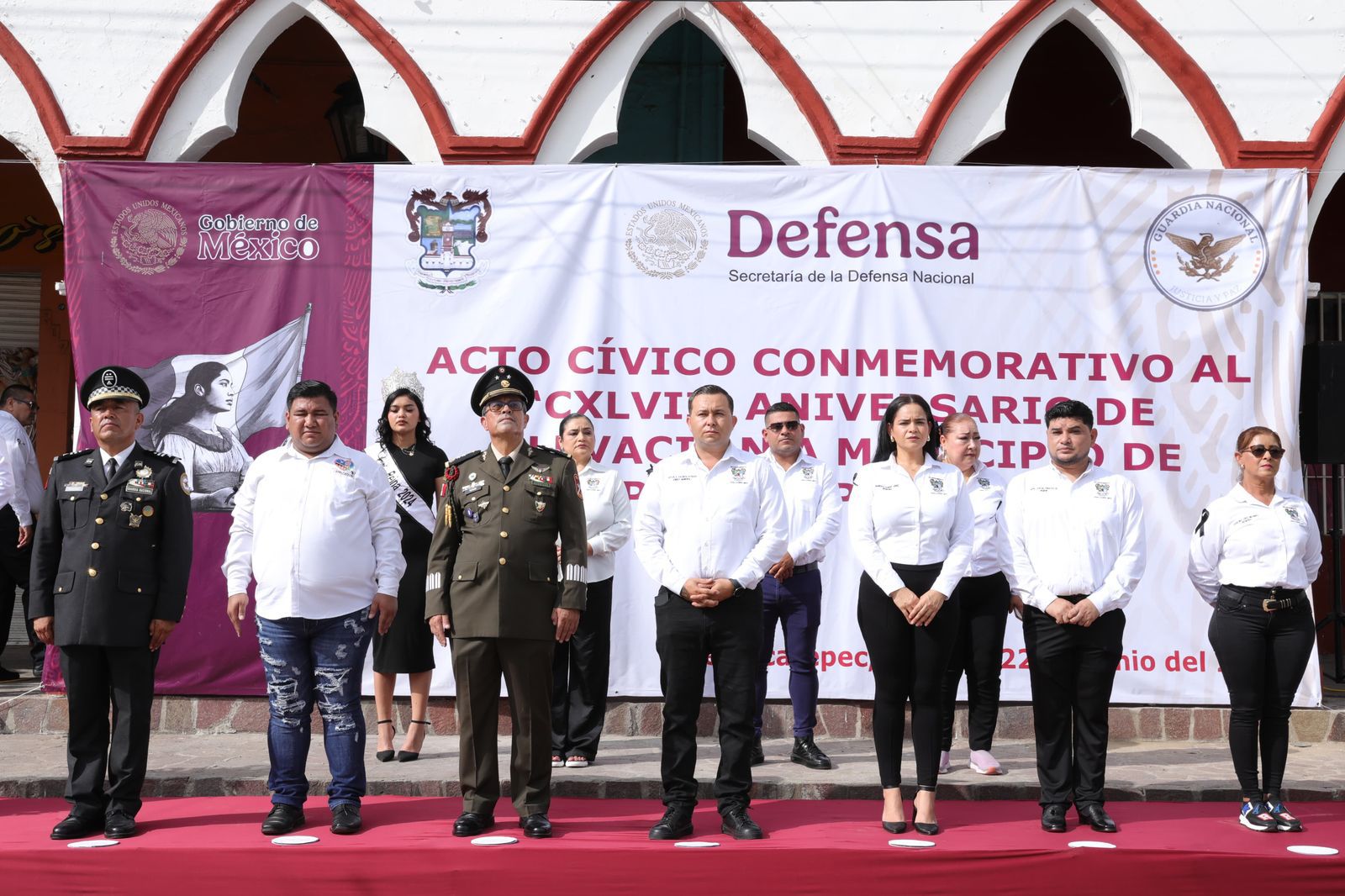 Las actividades fueron encabezadas por el general José Francisco Terán Valle, comandante de la 43 Zona Militar de Apatzingán, e iniciaron con un acto cívico en el Jardín San Francisco de Asís, donde se rindió un homenaje póstumo a la presidenta municipal, Martha Laura Mendoza Mendoza y a su esposo, destacando su legado de servicio y compromiso con la comunidad.