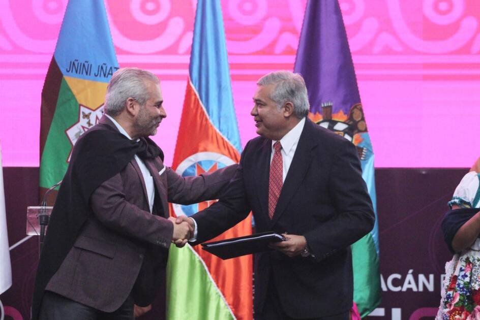 Morelia, Michoacán a 19 de noviembre del 2024.- El Congreso del Estado a través del presidente de la Mesa Directiva, diputado Juan Antonio Magaña de la Mora, recibió el Proyecto de Iniciativa de la Reforma Constitucional en materia indígena, por parte del titular del Ejecutivo Estatal, Alfredo Ramírez Bedolla.