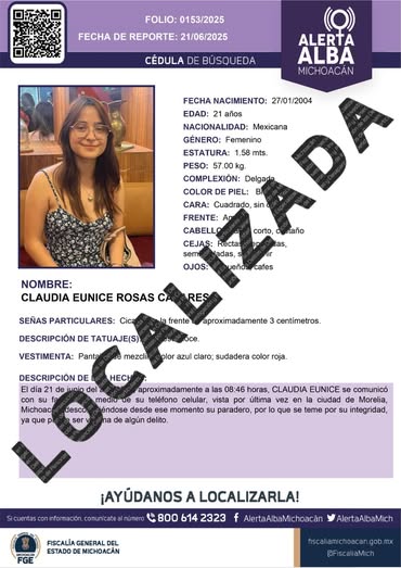 Morelia, Michoacán, a 23 de junio de 2025.- La Fiscalía General del Estado de Michoacán (FGE) desactivó Alerta Alba, tras localizar a una joven de 21 años de edad, que el pasado 21 de junio fue reportada como desaparecida en Morelia.