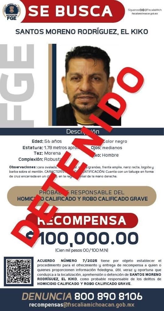Estos actos fueron del conocimiento del agente del Ministerio Público que inició a las actuaciones que permitieron establecer la identidad y posible relación de Santos “N”, el Kiko, lo que derivó, inicialmente, en la emisión del acuerdo de ofrecimiento de recompensa para su localización, adicional a las acciones de búsqueda que se implementaron en Michoacán, en coordinación con las autoridades estatales.
