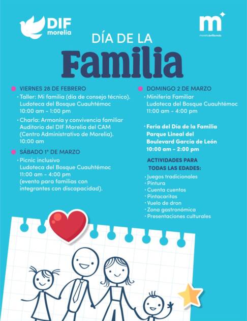 Morelia, Michoacán; 27 de febrero de 2025. – Con el propósito de fortalecer la convivencia y los lazos familiares, el DIF Morelia, encabezado por la Presidenta Honoraria, Paola Delgadillo Hernández, invita a la ciudadanía a participar en las actividades programadas para el Día de la Familia, que se llevarán a cabo del 28 de febrero al 2 de marzo en distintos espacios de la ciudad.