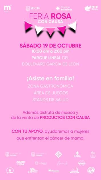 Morelia, Michoacán a 18 de octubre de 2024.- El DIF Morelia, que encabeza la Presidenta Honoraria, Paola Delgadillo Hernández, invita a todas las familias a participar en la Feria Rosa con causa, con motivo del Día Internacional de la lucha contra el cáncer de mama. Este evento, que forma parte de la campaña Prevenir es Vivir “Tu salud importa más”, se realizará mañana, sábado 19 de octubre, en el Parque Lineal del Boulevard García de León, de 10:00 am a 2:00 pm.