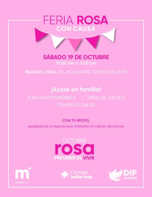 Morelia, Michoacán a 15 de octubre de 2024. – El DIF Morelia, que encabeza la Presidenta Honoraria, Paola Delgadillo Hernández, invita a las familias morelianas a participar en la Feria Rosa con causa, que se llevará a cabo el sábado 19 de octubre a partir de las 10:00 a.m. en el Parque Lineal del Boulevard García de León, como parte de la campaña Prevenir es Vivir “Tu salud importa más” por el Día Mundial de la Lucha contra el Cáncer de Mama.