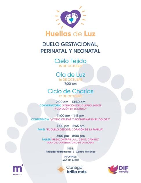 Mañana, jueves 17 de octubre, continuarán las actividades del programa “Huellas de Luz” con un ciclo de charlas y talleres a partir de las 9:00 a.m., enfocados en brindar herramientas emocionales y psicológicas para afrontar el duelo gestacional, perinatal y neonatal. Expertos en salud mental y tanatología abordarán cómo este tipo de duelo suele ser vivido en silencio, sin el acompañamiento necesario, e impartirán estrategias para que las familias puedan procesar y vivir su dolor de manera saludable.