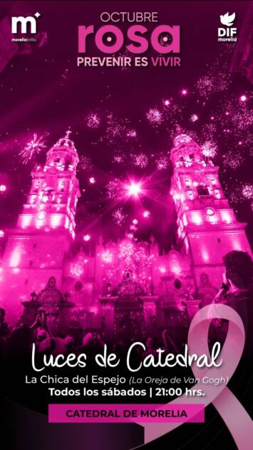 Morelia, Michoacán; 19 de octubre de 2024. – El Sistema DIF Morelia, que es encabezado por su Presidenta Honoraria, Paola Delgadillo Hernández, invita a las familias morelianas a unirse al Encendido de Catedral esta noche, como parte de las actividades de la campaña Prevenir es Vivir “Tu salud importa más”, cuyo fin es impulsar la conciencia y el apoyo contra el cáncer de mama.