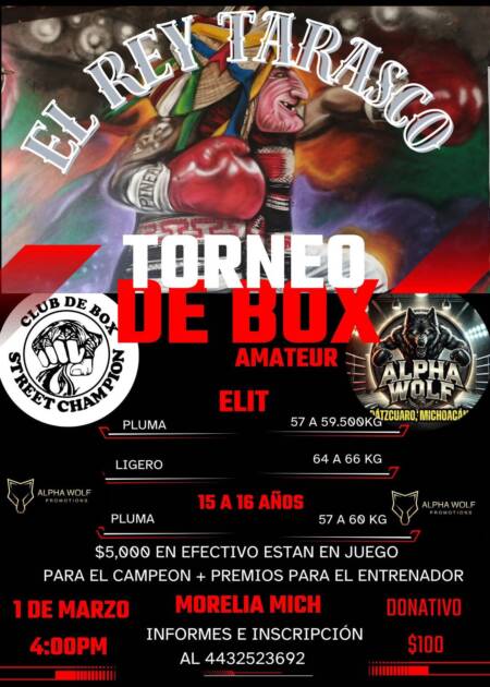 Para obtener más información y inscribirse, comunícate al 4432523692. ¡No te pierdas la oportunidad de luchar por el título! El Torneo de Box Amateur “El Rey Tarasco” es una oportunidad única para los boxeadores amateurs de la región de demostrar su habilidad y competir por un título y premios.