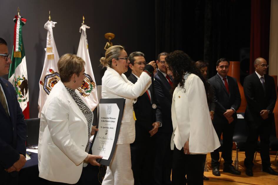 Morelia, Michoacán, a 01 de febrero de 2025.- 41 estudiantes de Posgrado de la Universidad Michoacana de San Nicolás de Hidalgo (UMSNH) fueron distinguidos por su excelencia académica con la Medalla “Dr. Ignacio Chávez Sánchez”, galardón que fue entregado por la rectora Yarabí Ávila González.