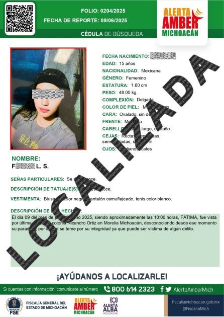 Morelia, Michoacán, a 17 de junio de 2025.- La Fiscalía General del Estado de Michoacán (FGE) desactivó la Alerta Amber emitida para la búsqueda de F.L.S., de 15 años de edad, quien fue reportada como desaparecida el pasado 9 de junio en el municipio de Morelia.