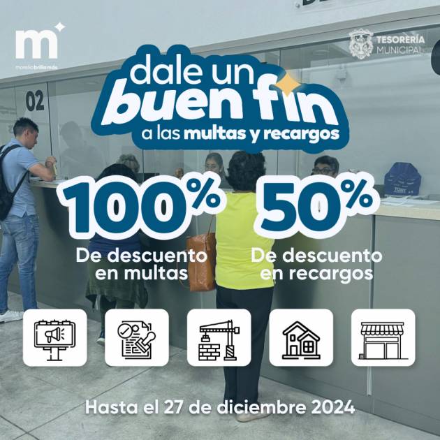 En gratitud al buen recibimiento de las y los contribuyentes, sumado al objetivo de continuar manteniendo un municipio sano en materia de impuestos municipales, el Ayuntamiento de Morelia extiende el periodo de los descuentos por Buen Fin hasta el día 27 de diciembre.