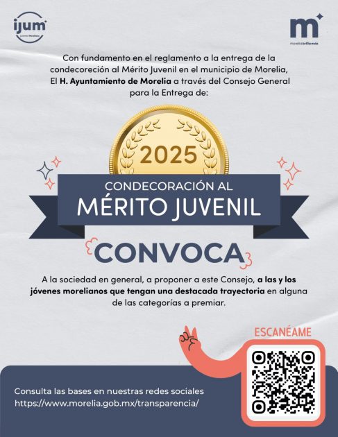 Morelia Michoacán; 03 de mayo de 2025.- Consciente de que la juventud es una pieza fundamental para el desarrollo y futuro de Morelia, el Gobierno Municipal, encabezado por el Presidente Alfonso Martínez Alcázar, refrenda su compromiso con este sector, a través del Instituto de la Juventud Moreliana (IJUM), recordando que está por concluir la convocatoria para participar en la Condecoración al Mérito Juvenil 2025.