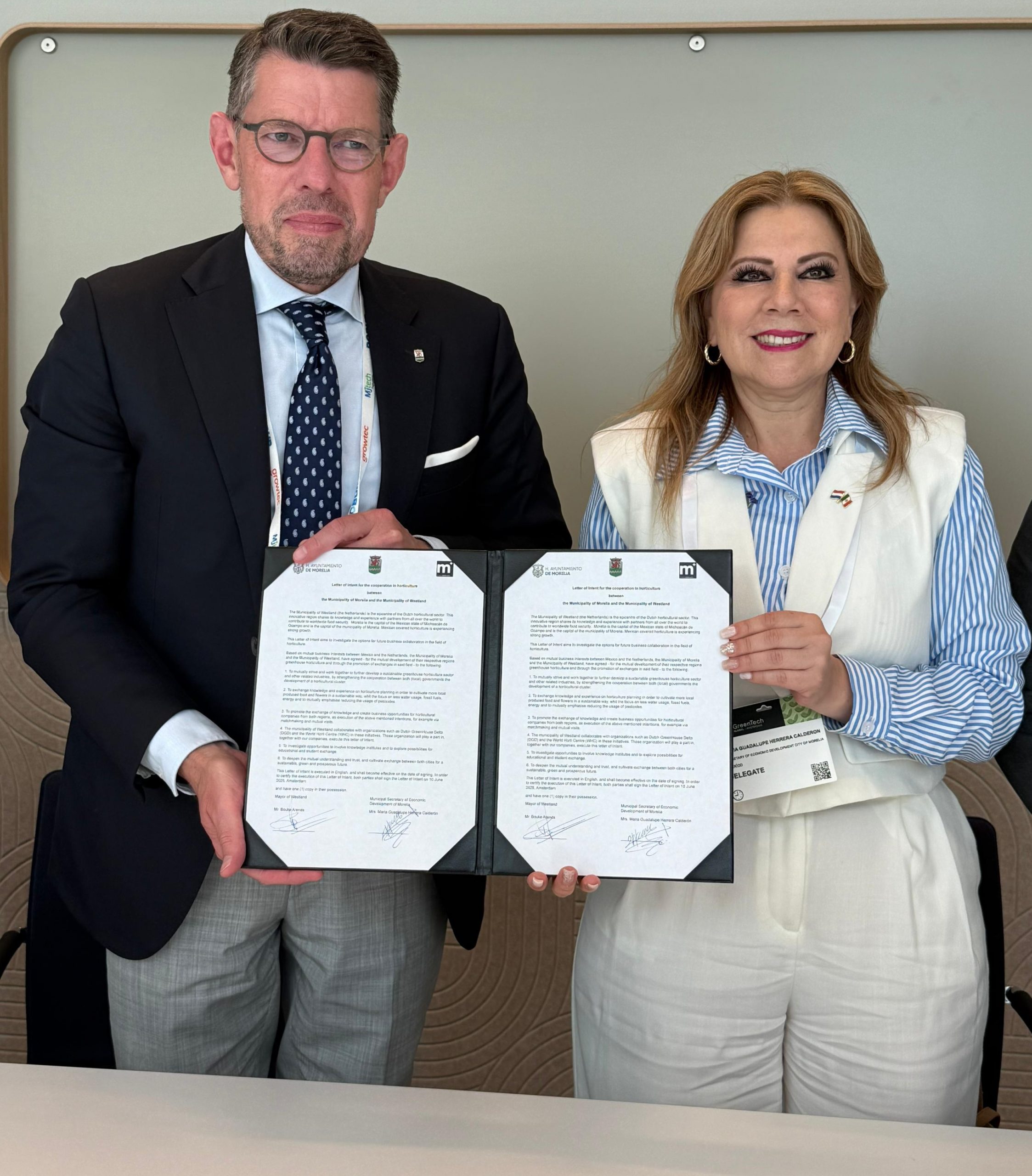 El convenio que abrirá nuevas oportunidades para productores, empresarios y comunidades de ambas regiones, fue firmado por el alcalde de Westland, Bouke Arends, así como por la titular de la Secretaría de Fomento Económico de Morelia (Sefeco), Guadalupe Herrera Calderón, en representación del alcalde Alfonso Martínez.
