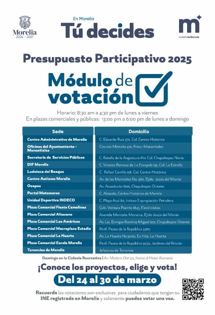 Morelia, Michoacán, a 30 de marzo de 2025.- Este domingo es el último día para que las y los morelianos participen en la votación de los proyectos que integrarán el Presupuesto Participativo 2025, y de esta forma colaborar activamente en las decisiones que beneficiarán a la ciudad y sus habitantes.