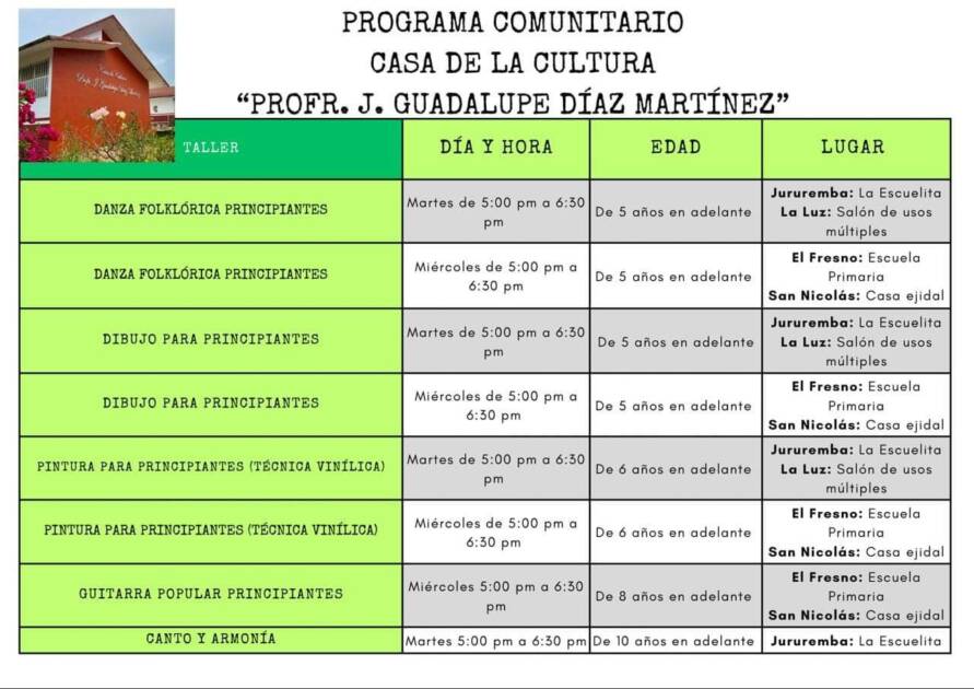 Villa Morelos, Michoacán, a 15 de octubre 2024. – Con el objetivo de fomentar el desarrollo cultural y artístico en el municipio, proporcionando espacios para la expresión creativa, el aprendizaje y la convivencia, el Ayuntamiento de Morelos, a través de la Casa de la Cultura “Profr. J. Guadalupe Díaz Martínez” extiende una cordial invitación a toda la comunidad para participar en sus diversos talleres artísticos y culturales.