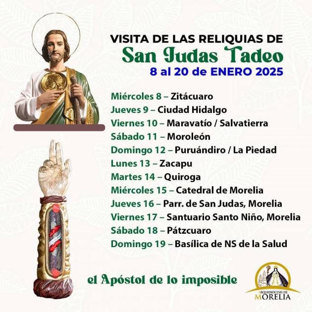 Morelia Michoacán a 14 de enero de 2025.- Ante la devoción popular hacia San Judas Tadeo en México y tras gestiones con el Vicariato de Roma la posibilidad de que la reliquia del brazo de san Judas Tadeo pudiera visitar el país, la cual desde tiempo inmemorial es venerada en la Basílica de San Salvatore in Lauro en Roma, se concedió el permiso correspondiente para que pudiera visitar las diferentes diócesis de la República Mexicana.