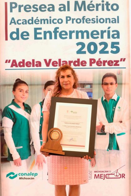 Morelia, Michoacán, 12 de mayo de 2025.- En la décimo segunda ceremonia de entrega de la Presea al Mérito Académico Profesional de Enfermería “Adela Velarde Pérez”, el Colegio de Educación Profesional Técnica del Estado de Michoacán (Conalep), otorgó su máximo galardón en el área de la salud a la destacada docente Laura González Villagómez.