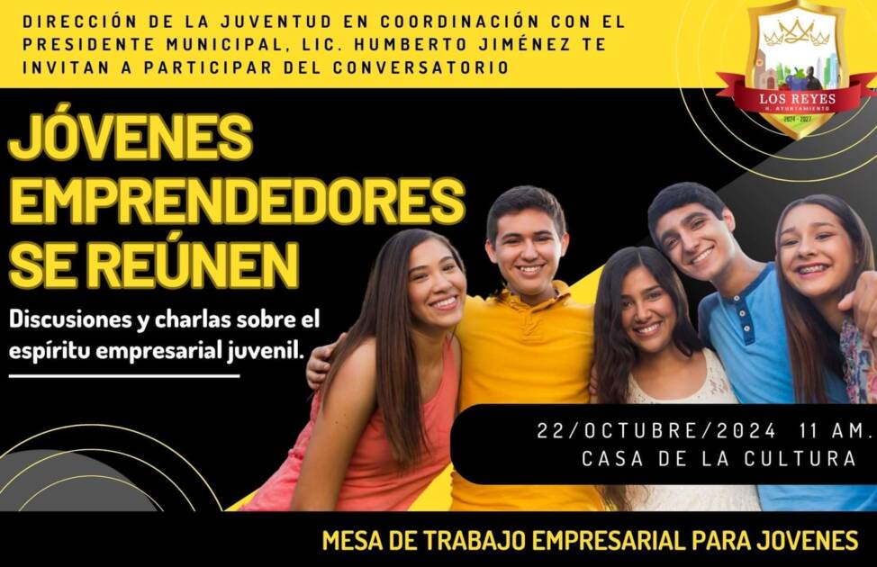 Los Reyes, Michoacán, a 21 de octubre de 2024.- Con el objetivo de fomentar la vinculación y la colaboración interinstitucional en beneficio de la juventud, el presidente municipal de Los Reyes, Humberto Jiménez Solís, en coordinación con la Dirección de la Juventud, invita a todos los jóvenes del municipio a participar en el conversatorio titulado “Jóvenes Emprendedores se Reúnen”.