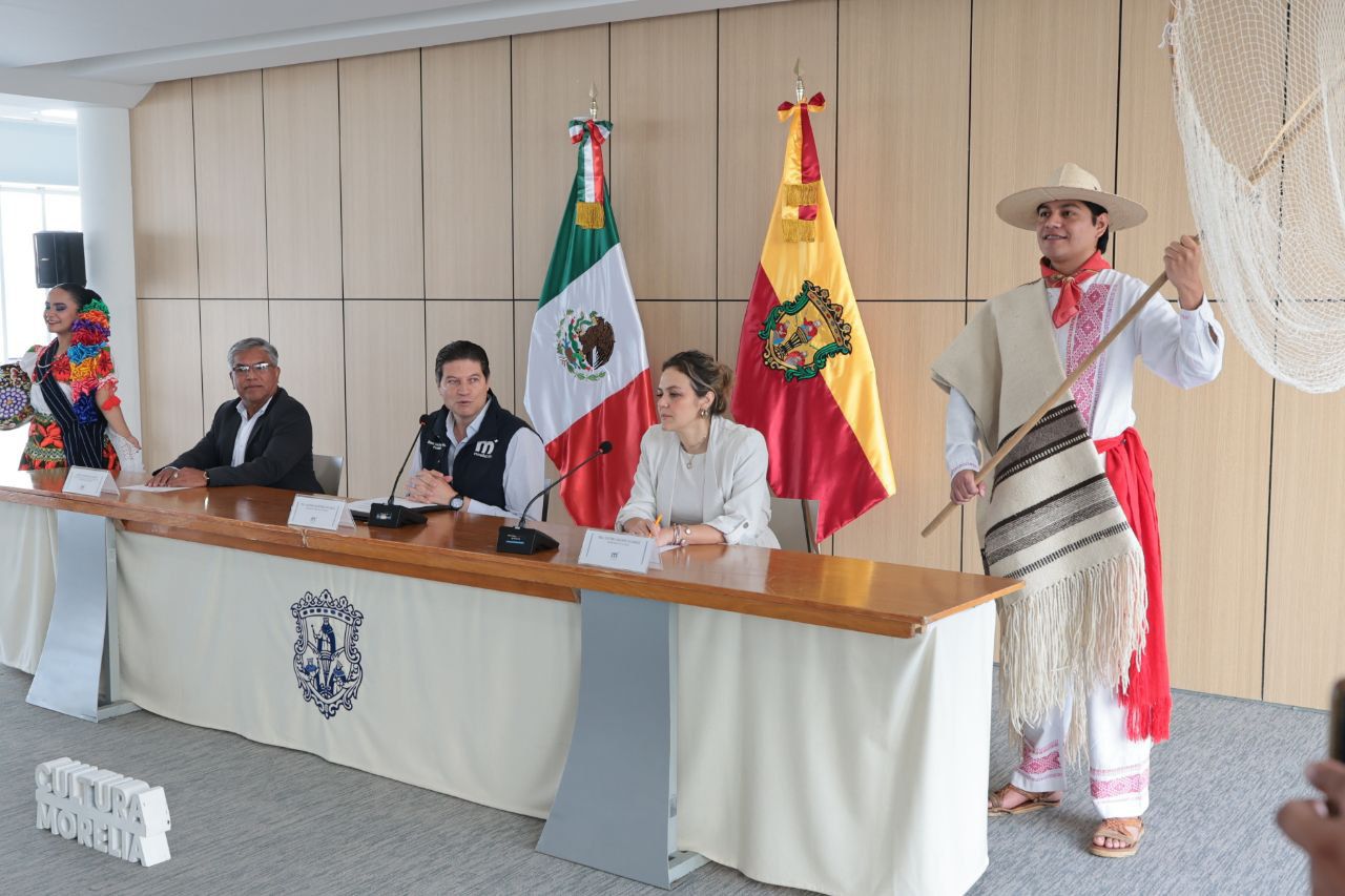 Durante la presentación, Alfonso Martínez estuvo acompañado por Fátima Chávez Alcaraz, Secretaria de Cultura de Morelia, y por Efraín Hernández Farfán, director artístico del Ballet Folklórico del Ayuntamiento de Morelia, quienes desglosaron las actividades a realizar durante su gira internacional.