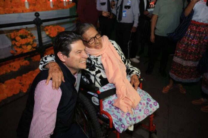 Luego de un breve mensaje, Alfonso Martínez y su esposa, Paola Delgadillo, recorrieron la plaza, en la que ya había cientos de familias caminando y tomando fotografías de los altares adornados con flores de cempasúchitl.