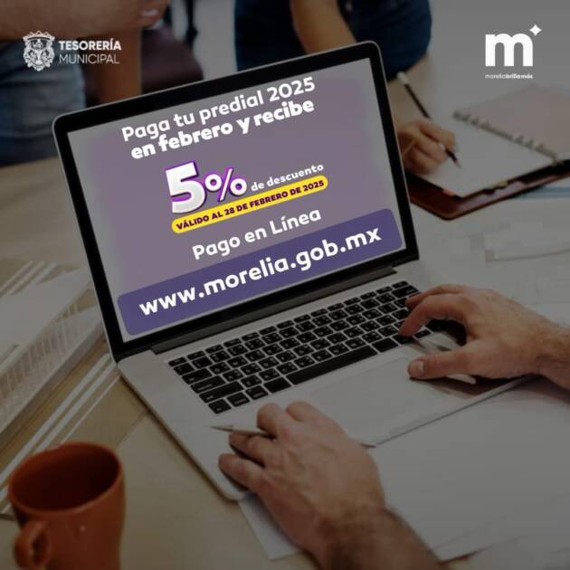 Morelia, Michoacán; 26 de febrero de 2025.- No te quedes sin aprovechar el 5 por ciento de descuento en el predial en Morelia, el cual estará vigente hasta el próximo viernes 28 de febrero del presente, tanto en módulos físicos como en línea: www.morelia.gob.mx.