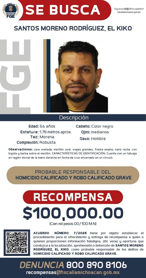 Con los datos de prueba idóneos y pertinentes recabados, la Fiscalía solicitó la respectiva orden de aprehensión en contra de Santos Moreno Rodríguez, alias “El Kiko”, por lo que se dispuso emitir el acuerdo de ofrecimiento de recompensa de 100 mil pesos a quien aporte información que conduzca a la localización y detención del investigado.