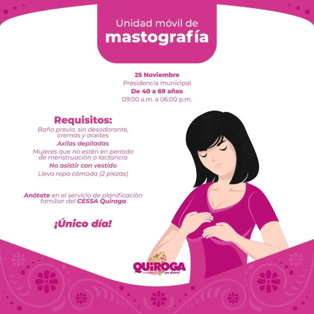 En ese sentido, la presidenta municipal, Alma Mireya González Sánchez, dio a conocer que la Unidad Móvil de Mastografía arribará a Quiroga el próximo 25 de noviembre en la presidencia municipal, en un horario de 9 a.m. a 6 p.m., para mujeres de 40 a 69 años de edad, quienes podrán realizarse este estudio de manera gratuita y con la comodidad de un servicio accesible en su propia comunidad.