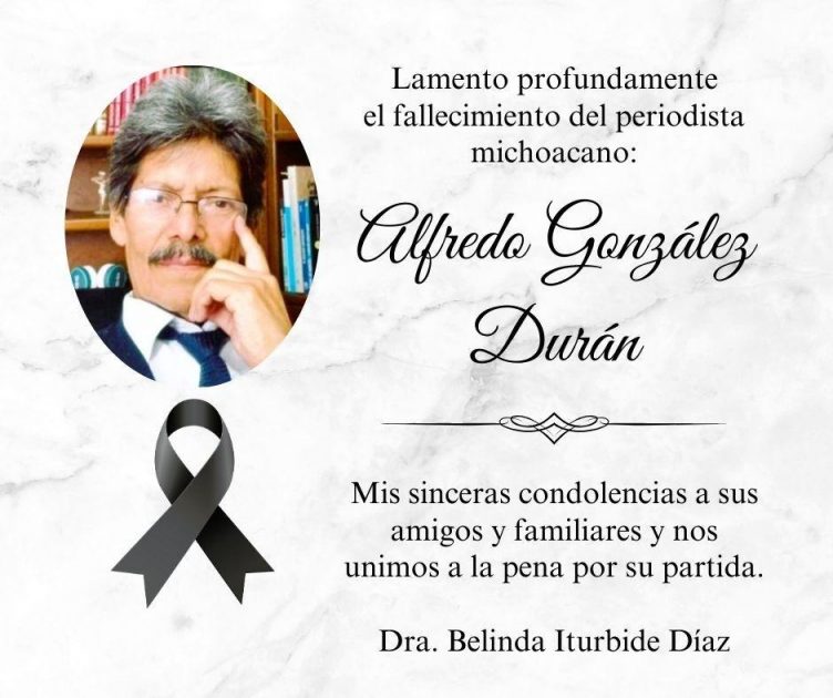 Como presidenta del Comité de Comunicación Social del Congreso del Estado de Michoacán, la diputada Belinda Iturbide Díaz lamentó el deceso del periodista Alfredo González, quien además de su aportación social fue fundador de la Asociación Michoacana de Periodistas (AMIPAC).