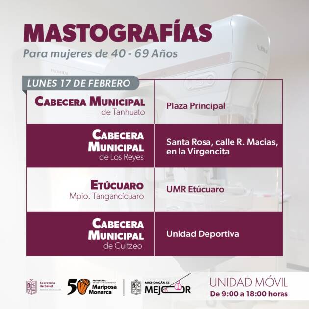 Morelia, Michoacán, 17 de febrero de 2025.- La Secretaría de Salud de Michoacán (SSM) refuerza la estrategia contra el cáncer de mama, a través de un despliegue de unidades móviles de mastografía, para realizar estudios gratuitos en la entidad a mujeres de 40 a 69 años de edad, y así promover la detección temprana de esta enfermedad.