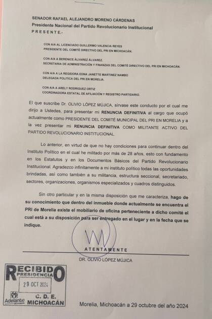 Morelia, Michoacán a 29 de octubre de 2024.- Olivio López Mujica ha presentado su renuncia definitiva como presidente del Comité Municipal del Partido Revolucionario Institucional (PRI) en Morelia, y ha decidido finalizar su militancia activa en el partido después de 28 años de servicio.