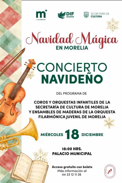 Morelia, Michoacán a 3 de diciembre de 2024.- A través de la Secretaría de Cultura Municipal, el Gobierno de Morelia invita al Concierto Navideño que presentarán las y los niños que forman parte del Programa de Coros y Orquestas Infantiles el próximo 18 de diciembre, como parte del compromiso que tiene la capital del estado en su nombramiento de Ciudad Creativa de la Música.