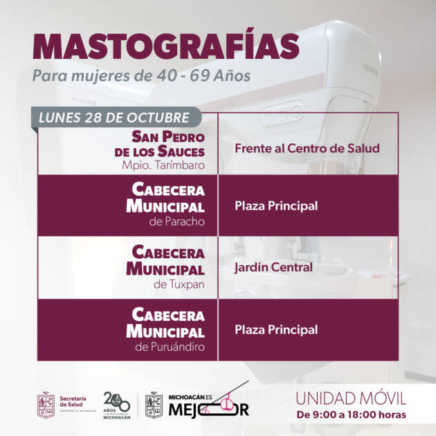Morelia, Michoacán a 27 de octubre de 2024.- La Secretaría de Salud de Michoacán (SSM) cierra el mes de octubre con mastografías gratuitas en 10 municipios a través de sus cuatro unidades móviles.