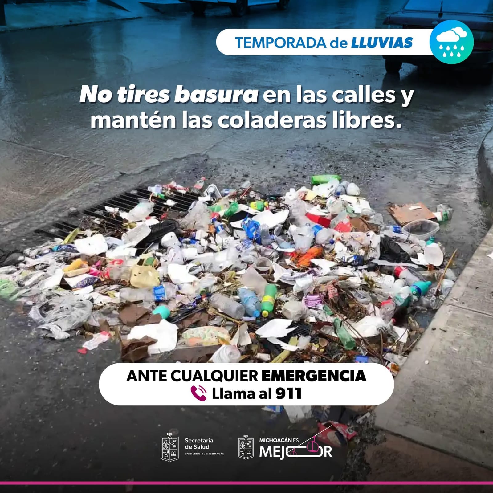 También limpiar desagües, canales, drenajes, tuberías y coladeras de manera permanente durante las lluvias para no propiciar encharcamientos; evitar tirar basura en las calles, alcantarillas y coladeras para no obstruir el drenaje que derive en inundaciones que pueden afectar las viviendas y por ende la salud de las y los michoacanos.