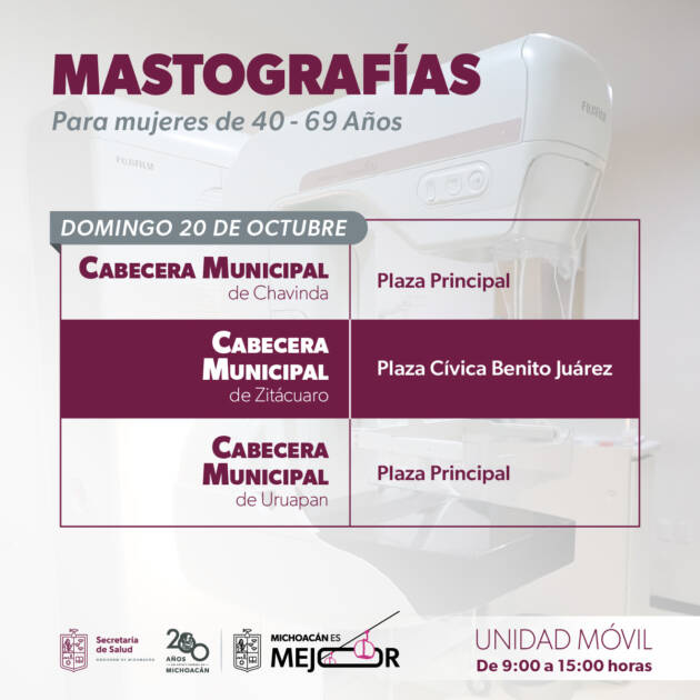 Los estudios se harán en unidades móviles equipadas con mastógrafos, con capacidad para atender hasta 120 usuarias por día, en horario de 9:00 a 15:00 horas. El sábado 19, los servicios estarán disponibles en la plaza cívica Benito Juárez de Zitácuaro y en la plaza principal de Chavinda.