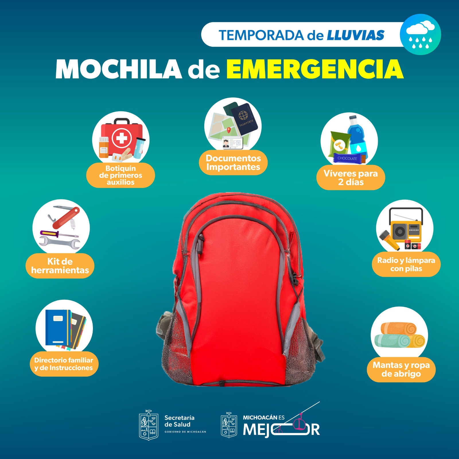 Morelia, Michoacán, 10 de junio de 2025.- Frente a la temporada de lluvias y huracanes, la Secretaría de Salud de Michoacán (SSM) te guía para armar de manera preventiva, una mochila para casos de emergencia, en caso de incremento en niveles de ríos y arroyos, así como desbordamientos e inundaciones en zonas bajas.
