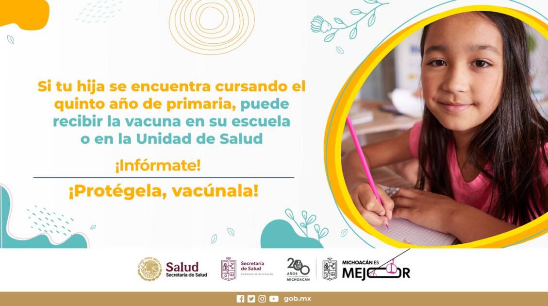 La vacuna es gratuita y se debe aplicar en las niñas de quinto año de primaria y rezagadas de sexto año, así como en las de 11 años que no acuden a la escuela y las adolescentes de 12 a 16 años que no se han inmunizado nunca.