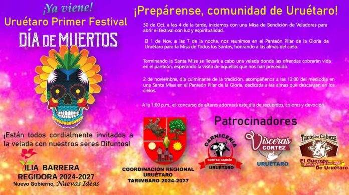 Uruétaro, Michoacán a 28 de octubre de 2024.- La comunidad de Uruétaro se prepara para su primer Festival de Día de Muertos, un evento impulsado por la regidora de la Comisión de Educación, Cultura y Turismo, Lic. Lilia Barrera Echeverría, en colaboración con la Coordinación Regional de Uruétaro. Con una serie de actividades religiosas y culturales, el festival promete ser un homenaje emotivo a las tradiciones mexicanas y a los seres queridos que han partido.